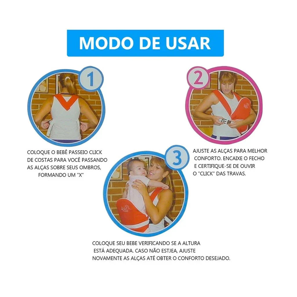 Com um design ergonômico, o canguru distribui o peso de maneira equilibrada nas alças acolchoadas, evitando desconfortos durante o uso. Além disso, o sistema de fechamento Click garante maior praticidade para colocar e retirar seu bebê com rapidez e segurança.